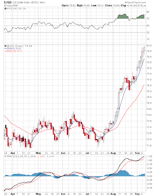 I’ve been bullish on the buck for quite a while now and in the past couple of months it’s ramped over 10% higher. However, it’s now running into some long-term resistance and looks more than a bit overbought in the short-term: