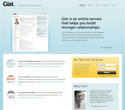 Probably the one new service I am most eagerly anticipating right now (shameless plug to get an early trial?) is Gist. From the company: “Gist is an online service that helps you build stronger relationships. By connecting your inbox to the web, you get business-critical information about key people and companies.”