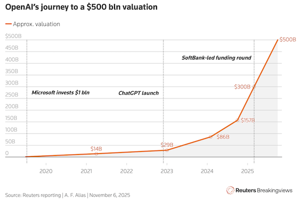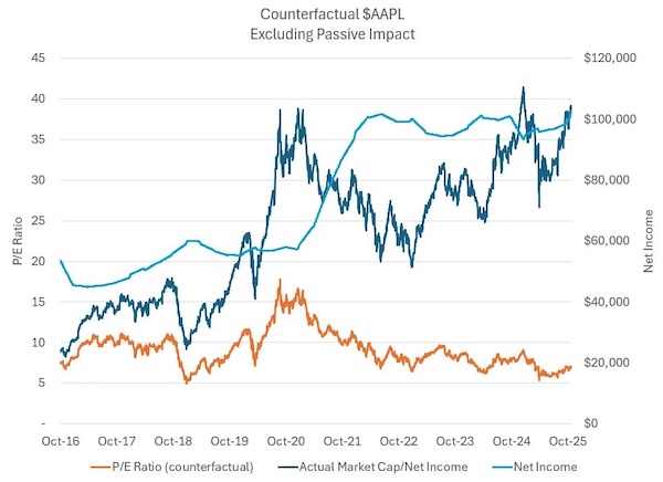 Even outside of the AI craze, though, valuations of the megacaps have been inflated to the extreme in large part by the shift to passive investing. “Fair value for Apple is around $50/share, with the remaining $220 attributable to ‘passive,'” writes Mike Green.