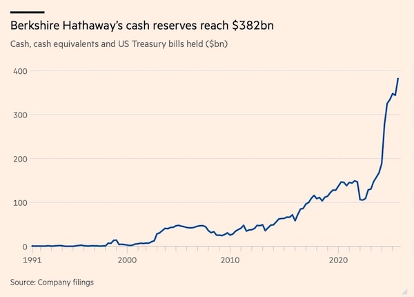 This may partly explain why Warren Buffett’s Berkshire Hathaway has never been more “fearful” in its approach to the stock market than it is today. As The Financial Times notes, cash at the company keeps hitting new records (both nominally and relative to the overall balance sheet).