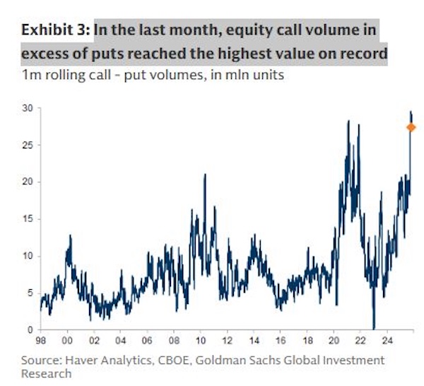 Meanwhile, by some measures, investor sentiment has never been more “greedy.” Goldman Sachs notes (via Mike Zaccardi), “In the last month, equity call volume in excess of puts reached the highest value on record.”