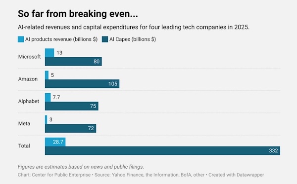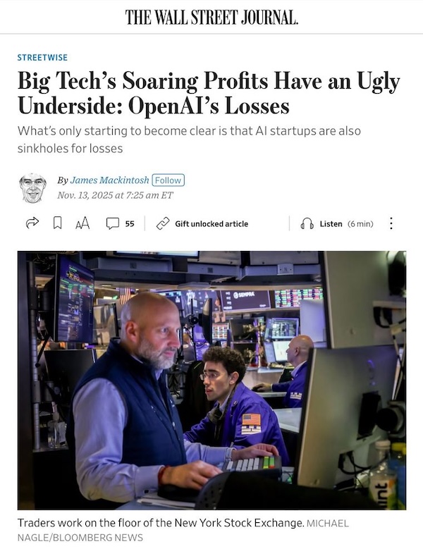 Many argue that, unlike the Dotcom bubble, Big Tech stocks today are highly profitable. However, as The Wall Street Journal points out, “OpenAI’s loss in the quarter equates to 65% of the rise in underlying earnings of Microsoft, Nvidia, Alphabet, Amazon and Meta together. That ignores Anthropic, from which Amazon recorded a profit of $9.5B from its holding in the loss-making company in the quarter.”