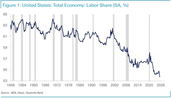Perhaps the single most important macro phenomenon of the past several decades is the precipitous decline in the labor share of income. As David Hay writes, “The Roots of Populism in the U.S. can be seen in the flip side of the long ascension by Corporate America’s profit margins: the long bear market in labor’s share of income.”