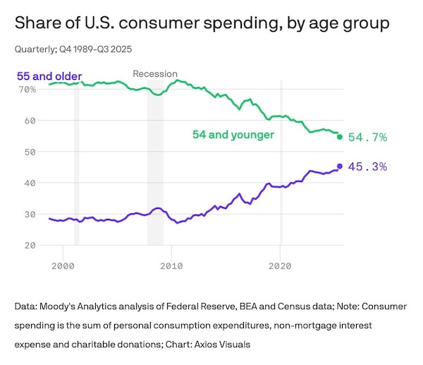 Supportive demographics trends and increasing globalization explain much of this dynamic. However, both are now in the process of shifting back in the other direction. As to the former, Axios reports, “Forget K-shaped, try gray-shaped: Older Americans are powering the economy.”